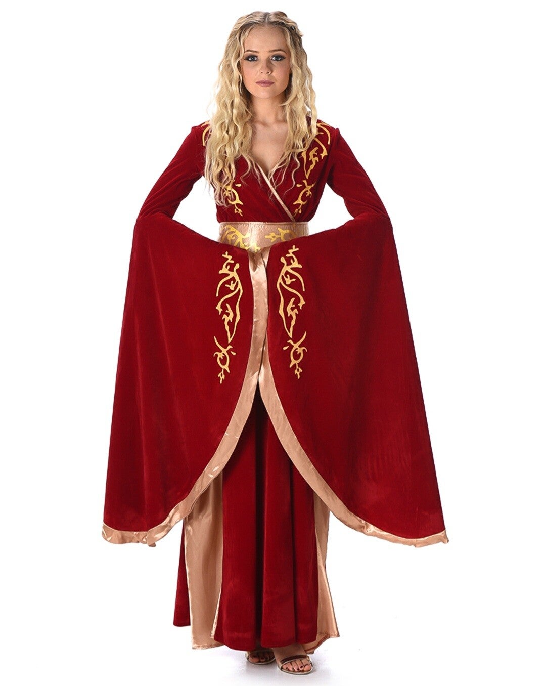 De prachtige (fluwelen) jurk heeft luxe gouden details en wijde mouwen die zorgen voor een indrukwekkende en koninklijke uitstraling. De bijpassende riem maakt de look helemaal compleet.