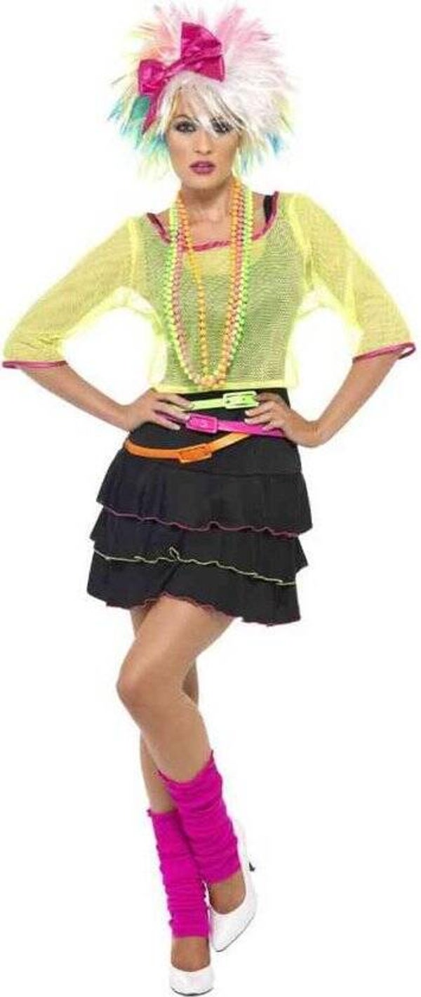 3 fluo riemen in volgende kleuren: roze, oranje en groen. Deze meten ongeveer 100 cm lang. Ideaal als aanvulling bij een jaren 80 verkleedkostuumlocatie: VH-