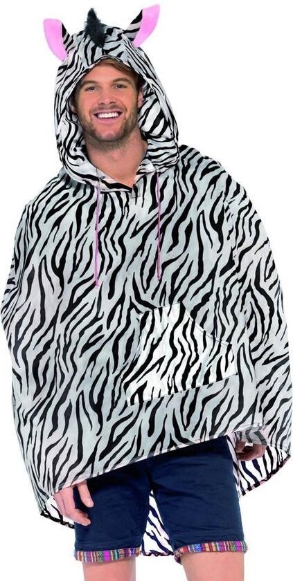Party regenponcho zebra. Deze poncho voor volwassenen met papegaai print is waterafstotend en erg geschikt voor bijvoorbeeld een buiten feest of festival. De poncho word geleverd in een bijpassend zakje met koord.
