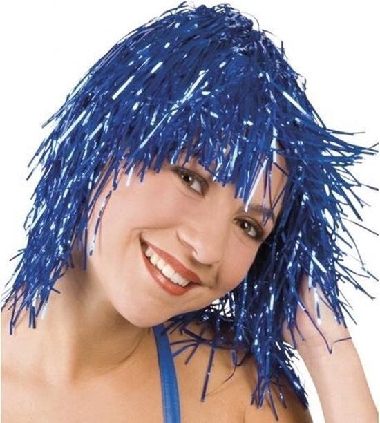 Een blauwe slierten pruik op schouder lengte en pony. Maat: One size, met elastisch net waardoor de pruik altijd goed zit.