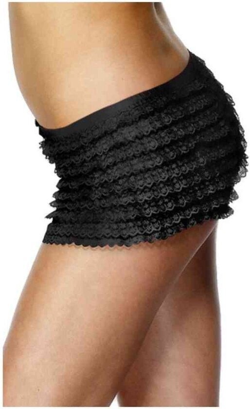 Een zwarte ruffles hotpants die ideaal kan zijn om de billen te bedekken bij een kort thema jurkje zoals bij een duivels kostuum of gewoon met een leuk topje.