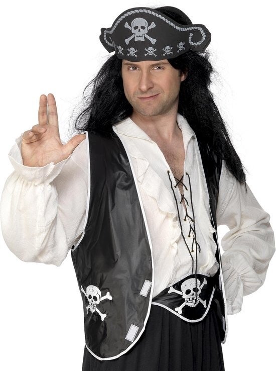 Deze piratenset voor volwassenen omvat: een hoed, een riem en een gilet (hemd en broek niet inbegrepen). Het ensemble is zwart en is bedrukt met witte doodskoppen. Deze set is perfect om uw kostuum voor verkleed-of themafeestjes compleet te maken.
