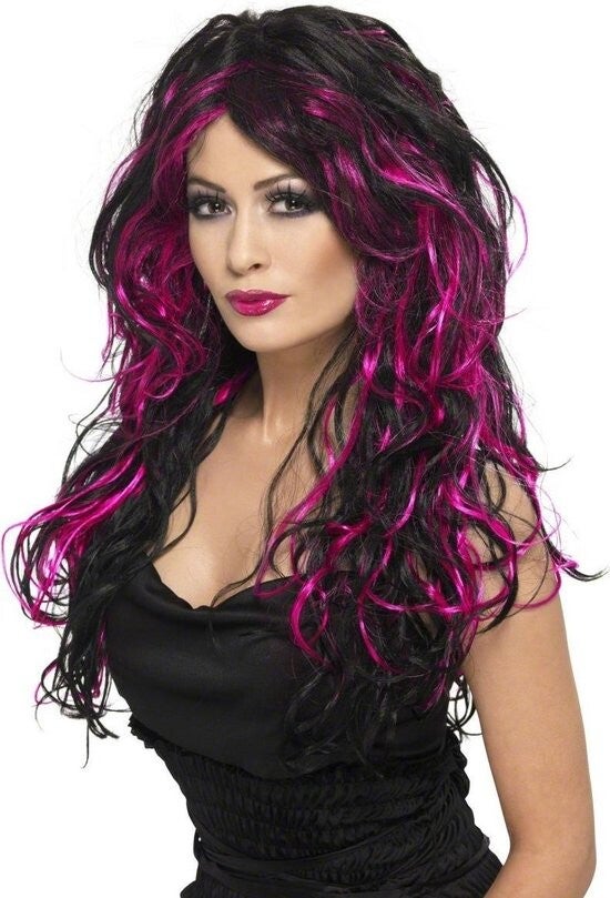 Zwart-fuchsiaroze pruik voor volwassen vrouwen - Deze lange zwarte pruik voor vrouwen beschikt over mooie fuchsiaroze lokken. De krullende haren zorgen voor veel volume in uw kapsel. Dit accessoire is ideaal om uw outfit voor Halloween of een andere gekostumeerde gelegenheid tot in de puntjes af te werken
