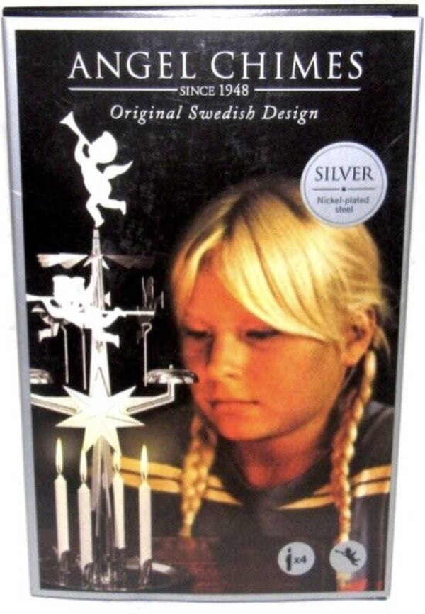 Deze zilveren Angel Chimes molen met de engelen geven echt het Kerstgevoel van vroeger! De zacht draaiende molen op de warmte van de kaarsjes en de kleine tingeling als de engeltjes de belletjes raken! Deze Angel Chimes zilver zijn het originele Zweedse ontwerp welke al jaren gebruikt wordt. 31 cm hoog en wordt geleverd met 4 kaarsjes.