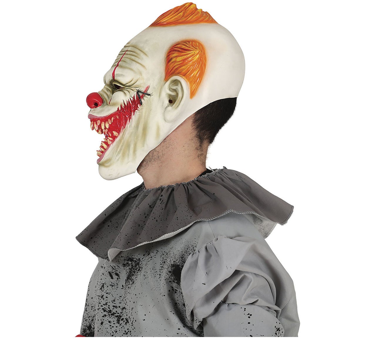 Het grijnzende horror clown latex masker is een absoluut hoogtepunt voor Halloween en andere spookachtige gelegenheden. Het masker toont een angstaanjagende clown met een brede, duivelse grijns die kippenvel veroorzaakt. De rode strepen die over de ogen lopen versterken het verontrustende effect en geven de clown een griezelige uitstraling. De hoektanden zorgen voor een extra dosis horror en geven het masker een griezelig tintje. Het oranje haar maakt de look compleet en geeft de clown een onderscheidende uitstraling. Het masker is gemaakt van hoogwaardige latex, die comfortabel aanvoelt op de huid en een uitstekende pasvorm biedt. Met dit masker trek je gegarandeerd alle ogen aan en zorg je voor veel eng plezier op je Halloween-feest of andere evenementen. Maak je engste nachtmerrie waar en verander in de grijnzende horrorclown met dit indrukwekkende latex masker.