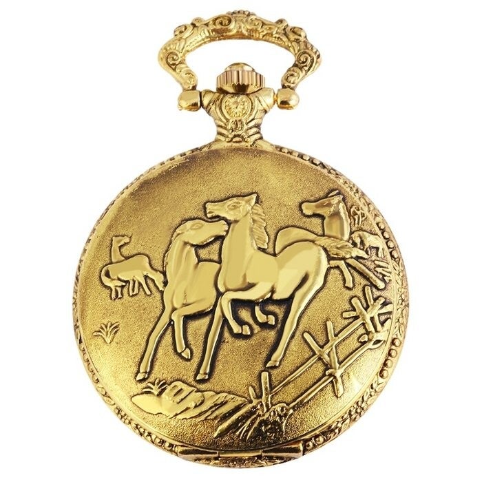 Dit elegante goudkleurige zakhorloge met een prachtig paardenontwerp aan de voorkant is een tijdloos accessoire voor liefhebbers van paarden en klassieke stijl. Het zakhorloge heeft een gouden afwerking en is voorzien van een gedetailleerd paardenmotief op het deksel, wat een vleugje verfijning en karakter toevoegt. Het horloge is niet alleen een functioneel hulpmiddel om de tijd te bewaren, maar ook een opvallend statement piece. Het compacte formaat en de bijgeleverde ketting maken het gemakkelijk om het horloge bij je te dragen, of het nu voor een speciale gelegenheid is of als sieraad.