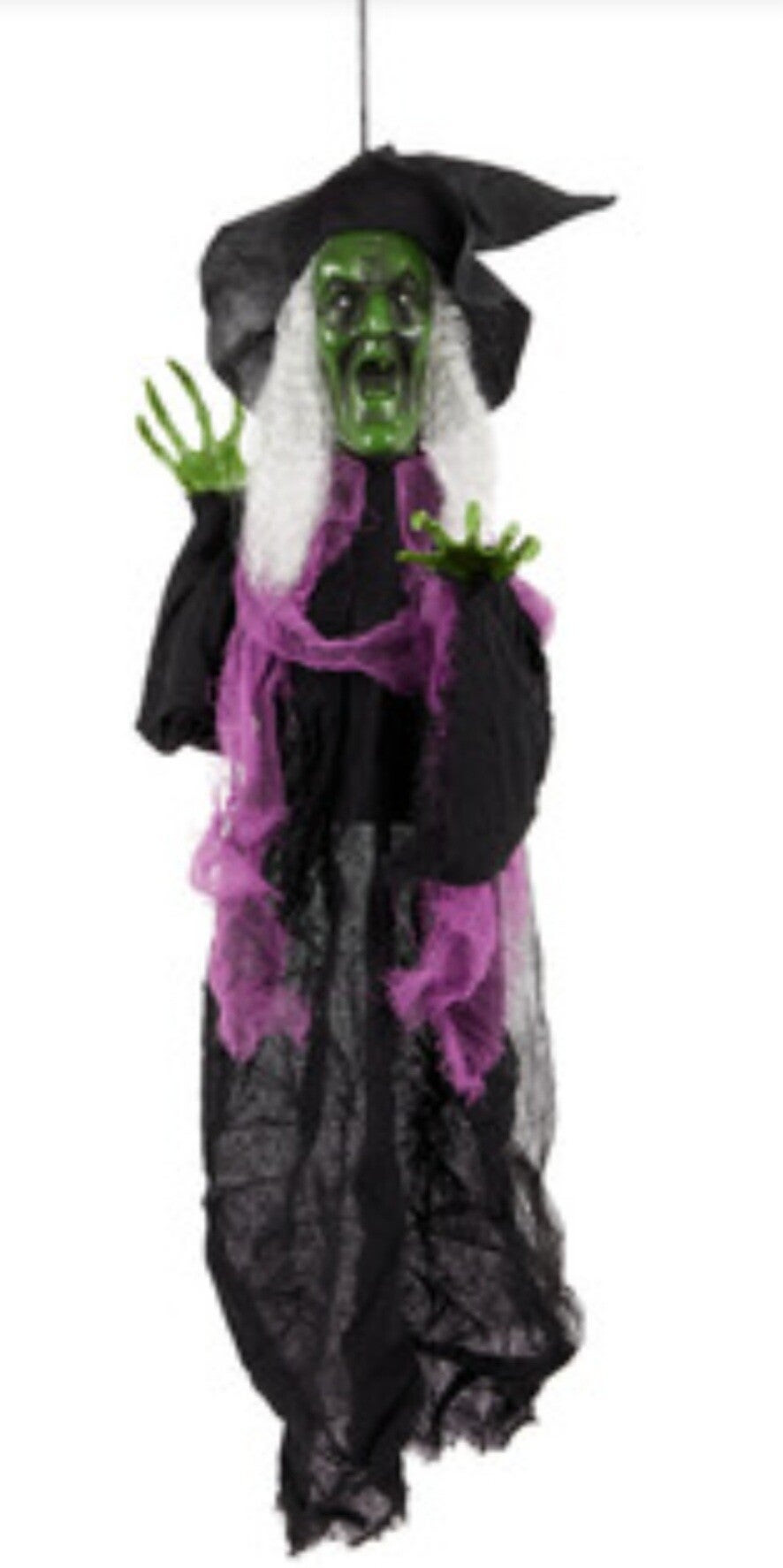 De heks werkt op 3 AA-batterijen en komt tot leven met bewegende armen, rood oplichtende ogen en griezelige heksengeluiden. Dankzij de handige ophanglus kun je haar eenvoudig bevestigen waar je maar wilt.