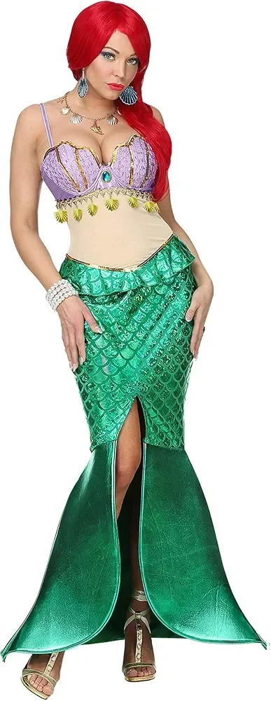 De top is voorzien van verstelbare bandjes en een opvallende decoratie van parel- en schelpelementen, perfect voor een fantasierijke look. De rok is nauwsluitend met een speelse split aan de voorkant, waardoor bewegen en dansen eenvoudig blijft. Combineer het kostuum met bijpassende accessoires voor een compleet onderwateravontuur.