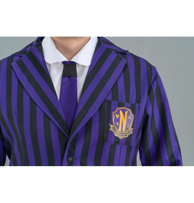 Stoere en stijlvolle Wednesday-look voor volwassenen. Dit heren kostuum bevat een zwart/ paars schooljasje, een wit overhemd voorkantje met stropdas en een bijpassende broek. Ideaal voor themafeesten, Halloween, carnaval of cosplay.