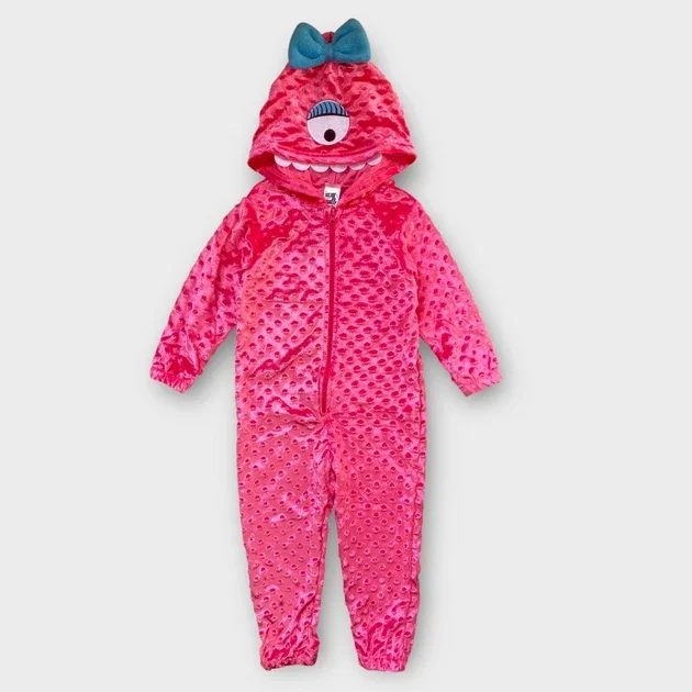Deze leuke en comfortabele onesie verandert je kind in een schattig roze monster! Het pak heeft een grote blauwe strik op het hoofd en één speels oog voor een grappige en unieke look. Perfect om in te spelen, te knuffelen of te dragen tijdens verkleedfeestjes.