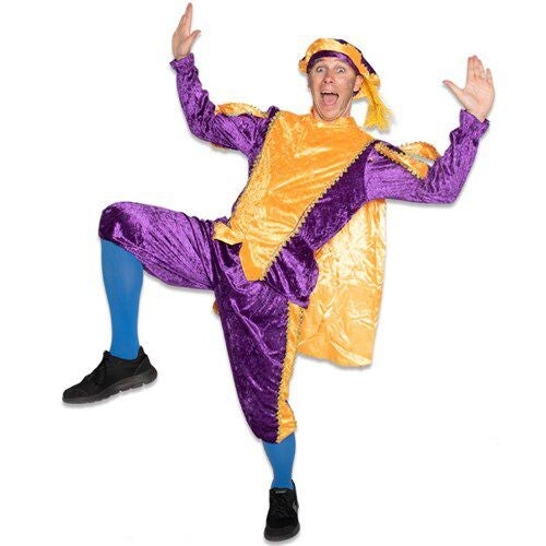 Val op tijdens Sinterklaasactiviteiten met dit paars/gele Pietenpak, compleet met cape! Dit kostuum combineert vrolijke kleuren met een klassiek Pietendesign, ideaal voor optochten, shows of feestjes.