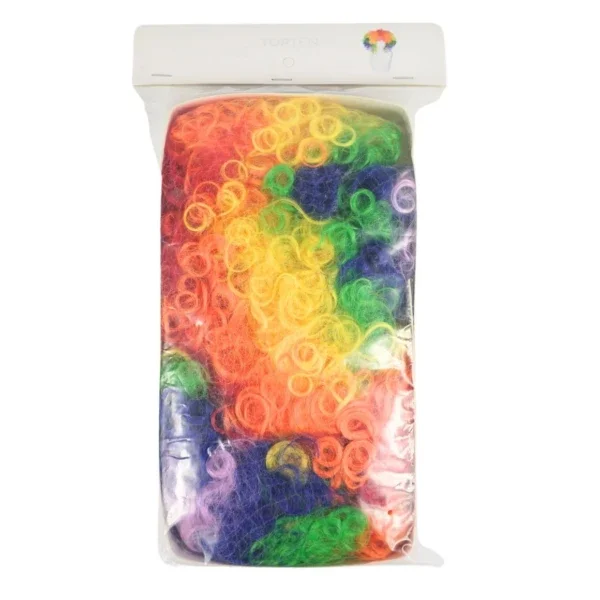 Tijd om te lachen! Met deze multicolour clownspruik van Top Ten ben jij direct het middelpunt van elk feest. Perfect voor carnaval, themafeesten, kinderfeestjes of een grappige verkleedavond.