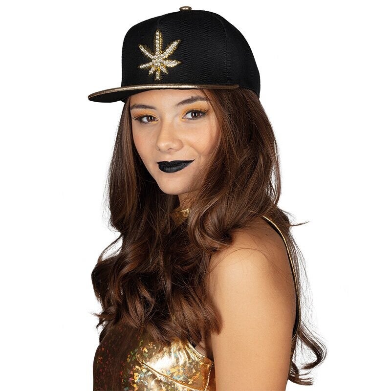 Maak een statement met deze stijlvolle zwarte pet met een opvallend gouden wietlogo, afgewerkt met een subtiel diamantjes voor een luxe touch. De gouden klep geeft de pet een exclusieve en moderne uitstraling die direct in het oog springt.