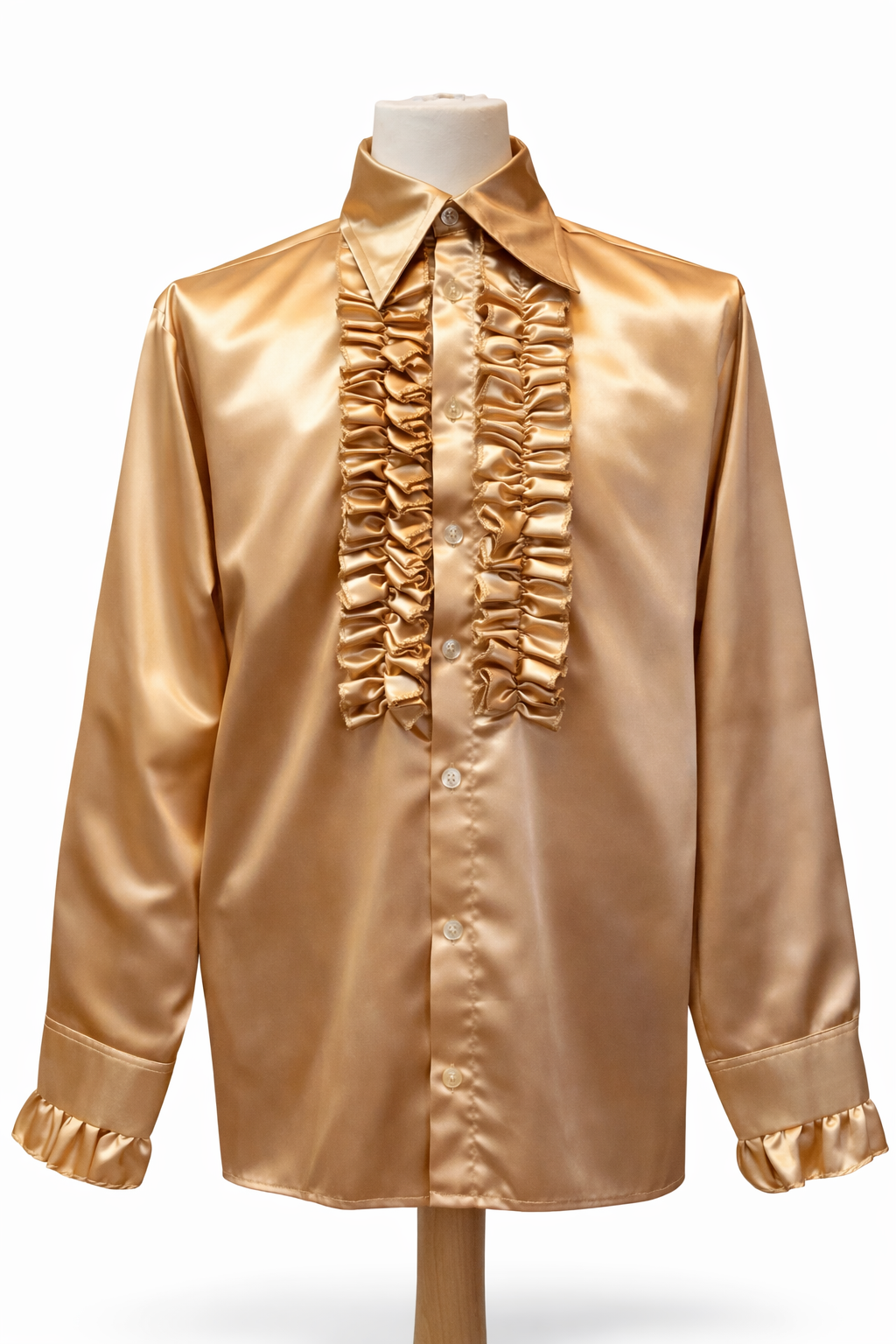 Opvallende en stijlvolle blouse met een glanzende uitstraling. Deze blouse is uitgevoerd in goudkleurige stof en afgewerkt met elegante ruches aan de voorzijde en geruffelde manchetten, wat zorgt voor een echte retro- en feestlook.
