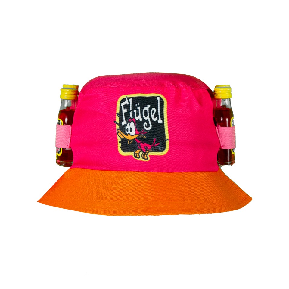 Maak je outfit compleet met deze opvallende roze bucket hat met contrasterende oranje rand. Op de voorkant vind je de herkenbare, speelse ogen van de bekende Flügel-eend en op de achterkant staat het karakteristieke Flügel-logo. Een echte blikvanger voor carnaval, festivals of andere feestelijke gelegenheden.