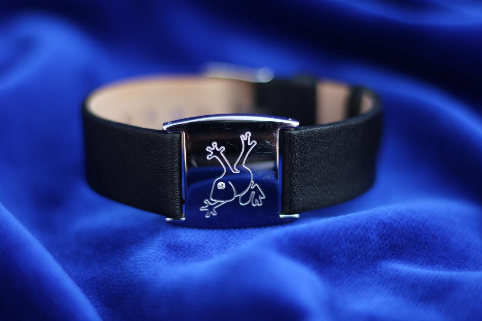 Deze unieke Energetix armband combineert een strak leren band met een opvallende roestvrijstalen sluiting in de vorm van een kikker. Het oog van de kikker is voorzien van een fonkelend Swarovski kristal, wat zorgt voor een speels en luxe detail.